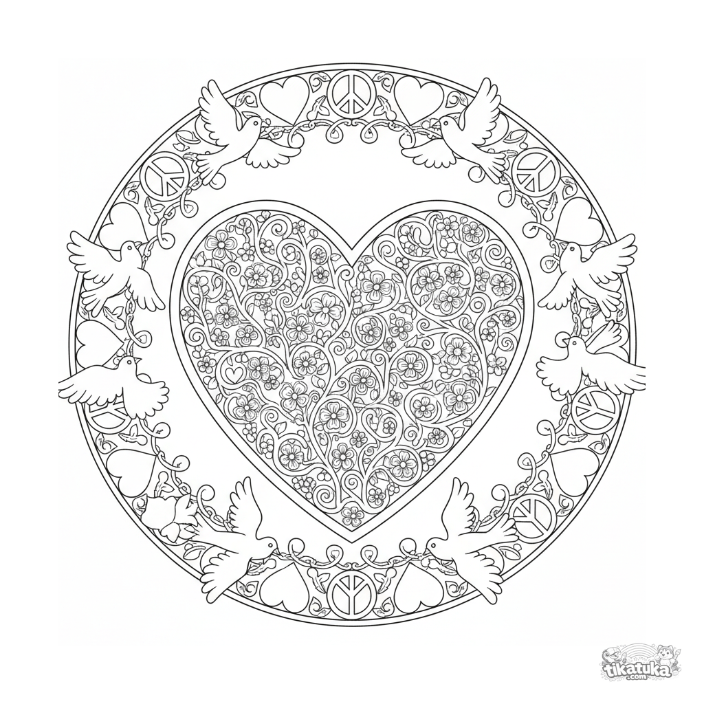 Изящная мандала в форме сердца, украшенная цветочными лозами и летящими голубями. Детальная и позитивная раскраска для детей 10-12 лет.
