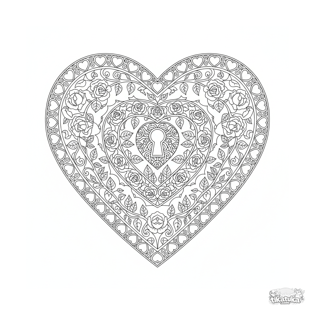 Сложная мандала в форме сердца для раскрашивания, возраст 10-12 лет. Центральное ключевое отверстие, концентрические кольца цветочных лоз, бордюр из маленьких сердечек.