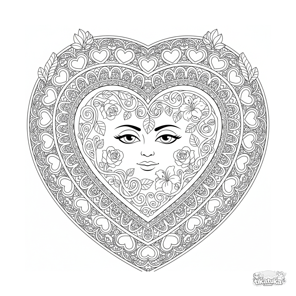 Изысканная мандала в форме сердца, сплетенная из цветочных виноградных лоз и кружева. Сложная раскраска для детей 10-12 лет в технике бумажной вырезки.