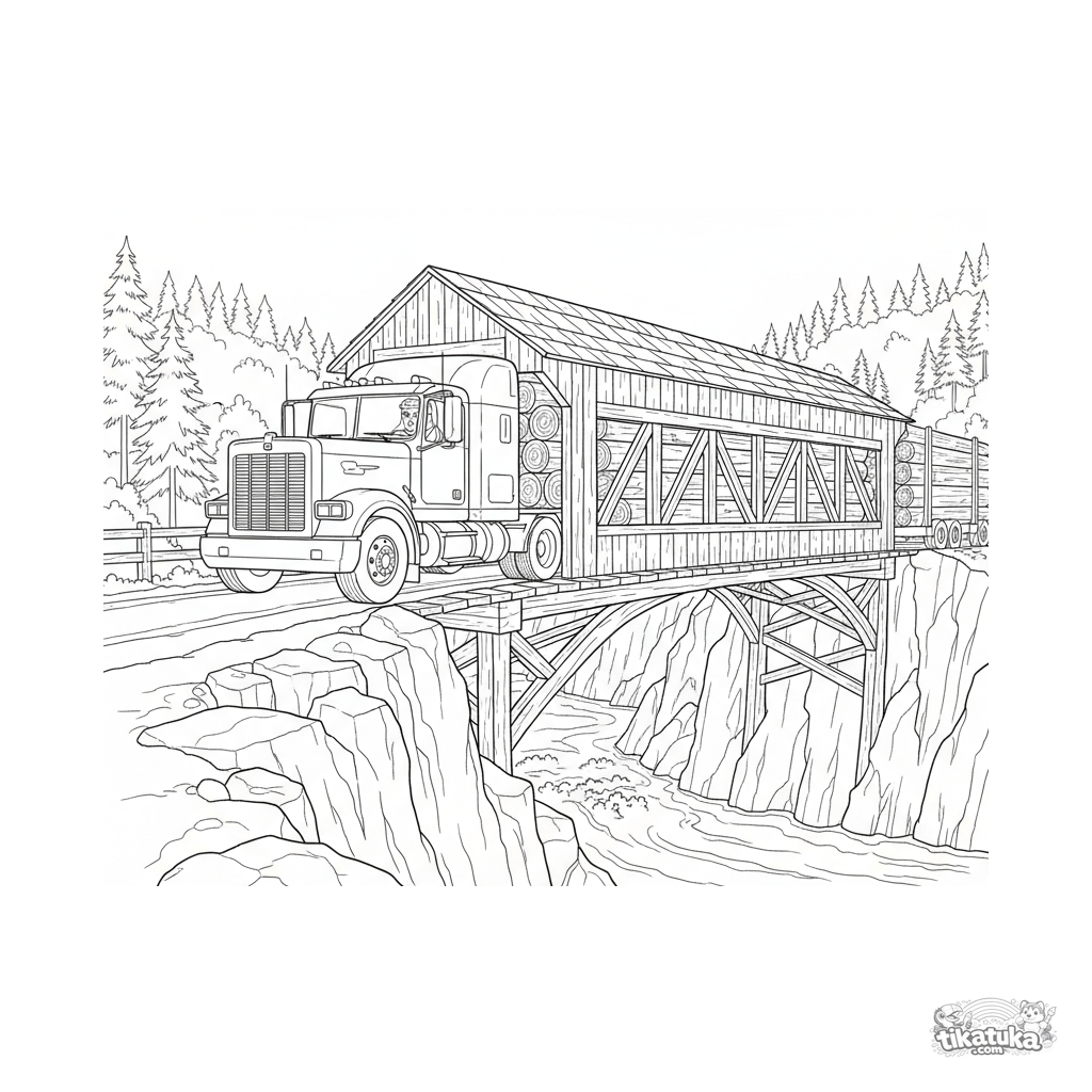 Сложная раскраска для детей 10-12 лет: мощный лесовоз везёт брёвна по старинному деревянному мосту над речным ущельем. Много деталей, реалистичный стиль.