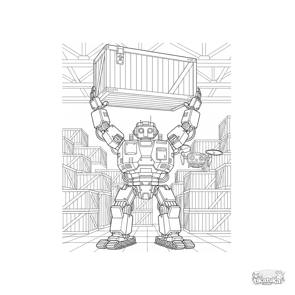 Сложная раскраска для 10-12 лет: мощный промышленный робот-грузчик с гусеницами поднимает огромный ящик под потолок склада. Детализированная гидравлика, ряды коробок, летающий дрон.