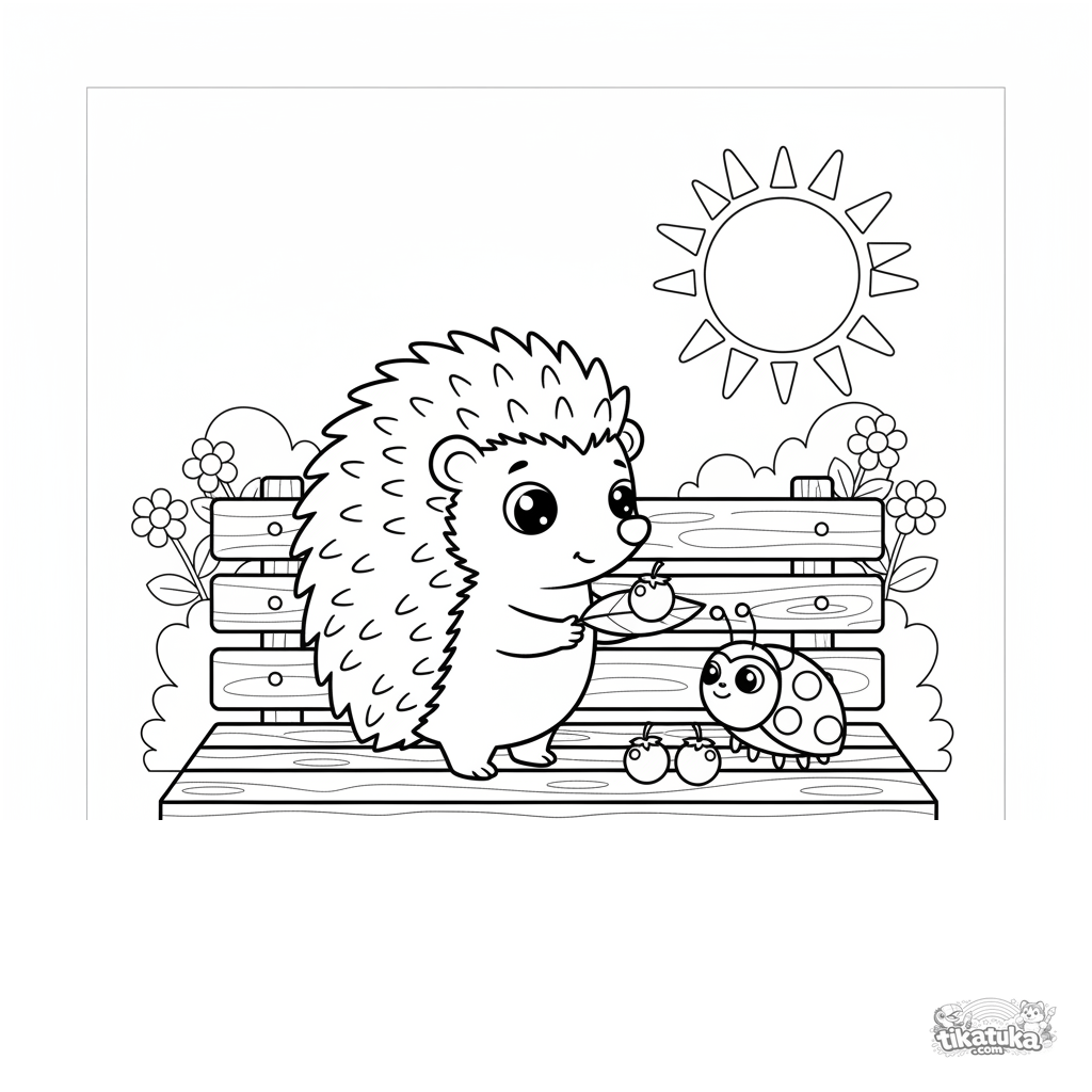 Раскраска для детей 7-9 лет: добрый ёжик на скамейке в парке делится ягодами с божьей коровкой. Милая сценка о дружбе и щедрости.