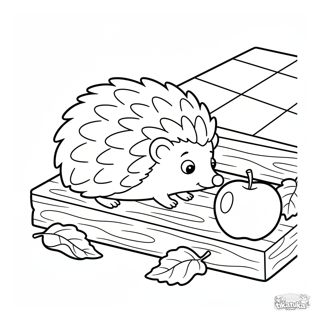 Простая раскраска для малышей 2-3 года: милый ёжик нюхает яблоко на ступеньке веранды. Крупные чёткие формы, мало деталей, идеально для первых карандашей.