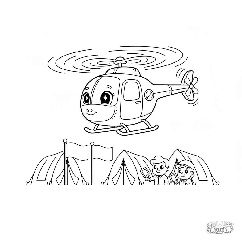 Раскраска для детей 4-6 лет: вертолет совершает посадку у полевого штаба. Сцена с экипажем, флажками и палатками, динамичные линии.