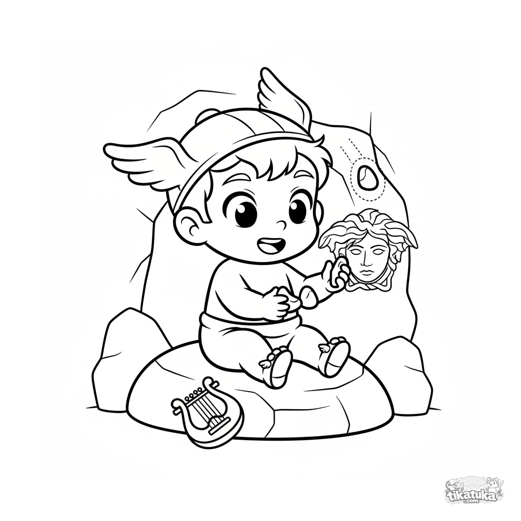 Простая раскраска в стиле аниме для малышей 2-3 года: малыш Гермес в крылатых сандалиях весело играет в камушки на полу логова Горгоны.