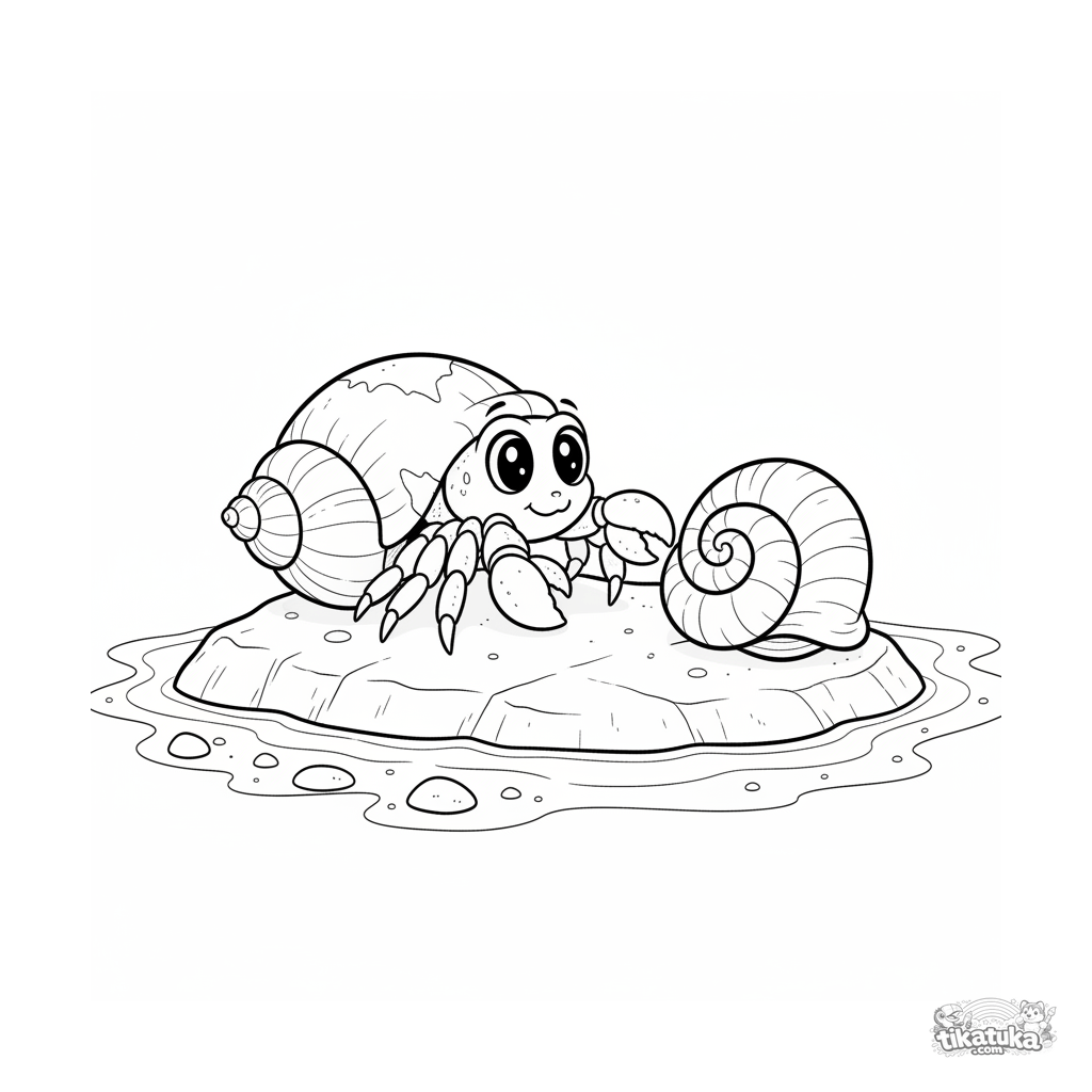 Раскраска с крабом-отшельником, переезжающим в новую ракушку в солнечном приливном бассейне. Для детей 7-9 лет. Динамичная поза, умеренная детализация.