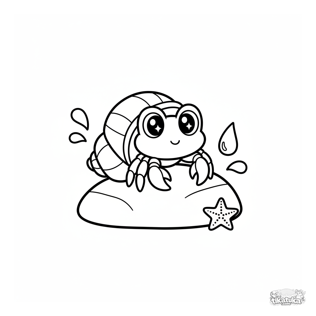 Простая раскраска для малышей: краб-отшельник выглядывает из ракушки на солнечном камне в мелкой луже. Крупные формы, мало деталей. Для детей 2-3 лет.