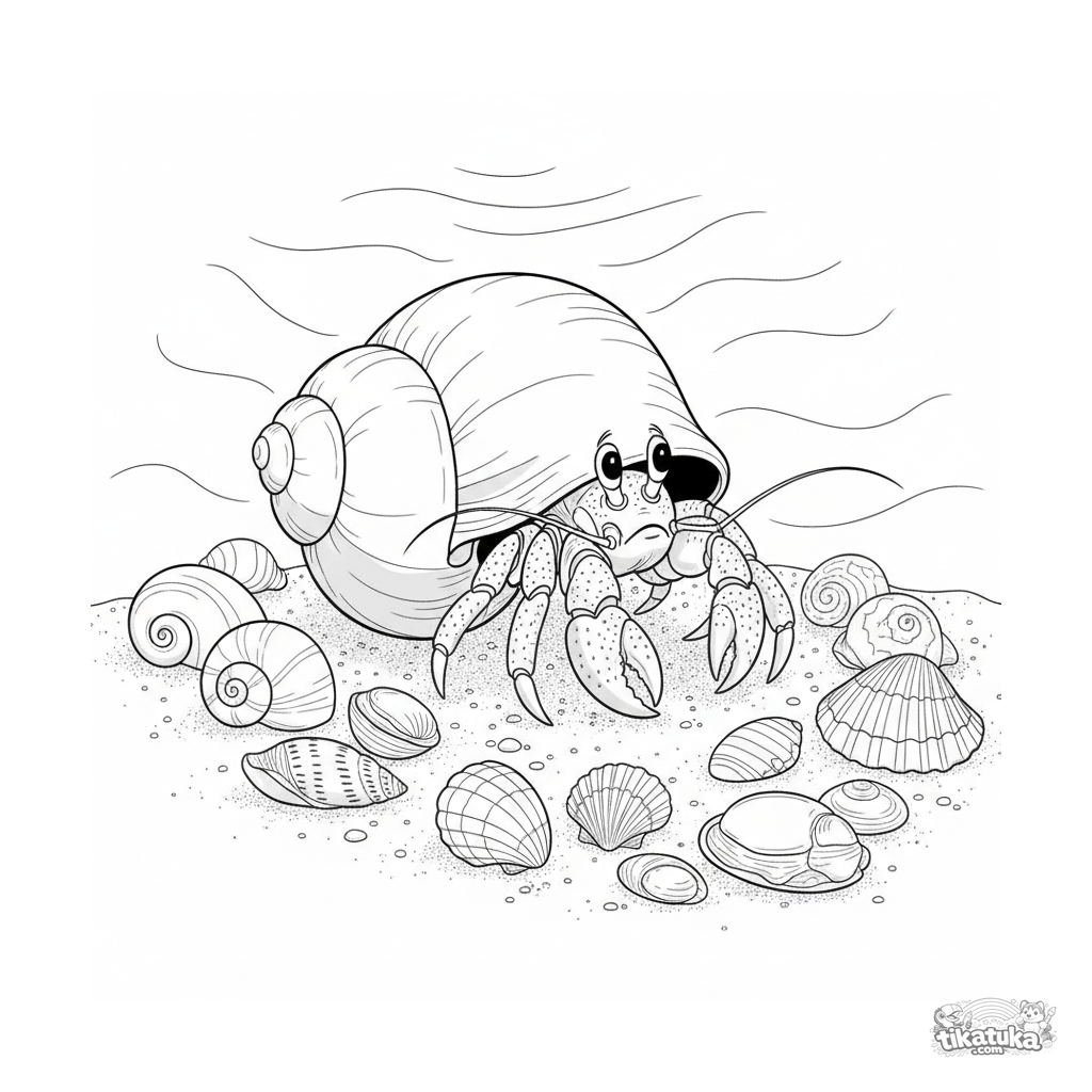 Детальная раскраска для детей 10-12 лет: краб-отшельник выбирает новый домик среди ракушек на солнечном мелководье. Реалистичное полевое изображение.