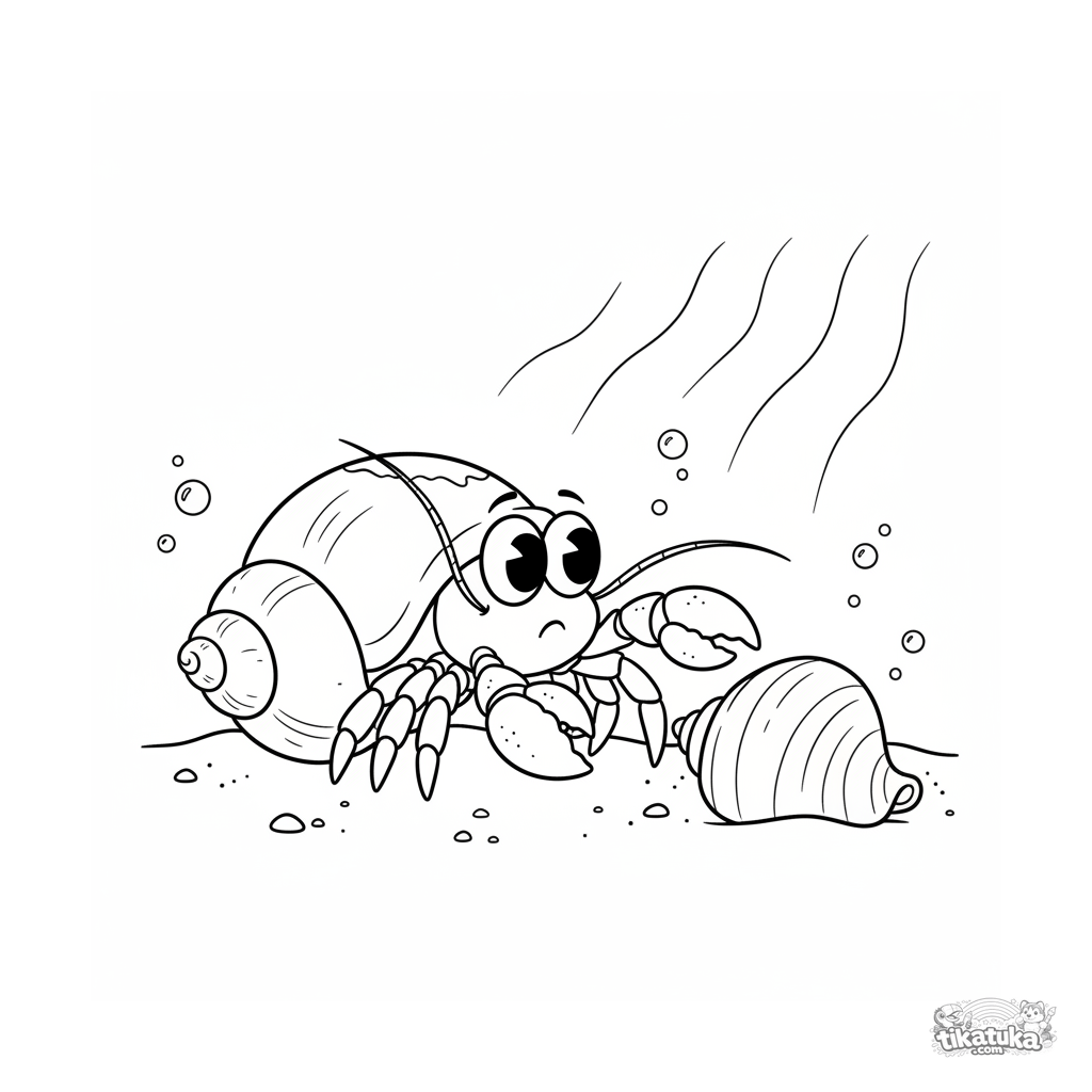 Раскраска с крабом-отшельником, меняющим свой домик-ракушку на мелководье в солнечном луче. Сцена с деталями для детей 7-9 лет.