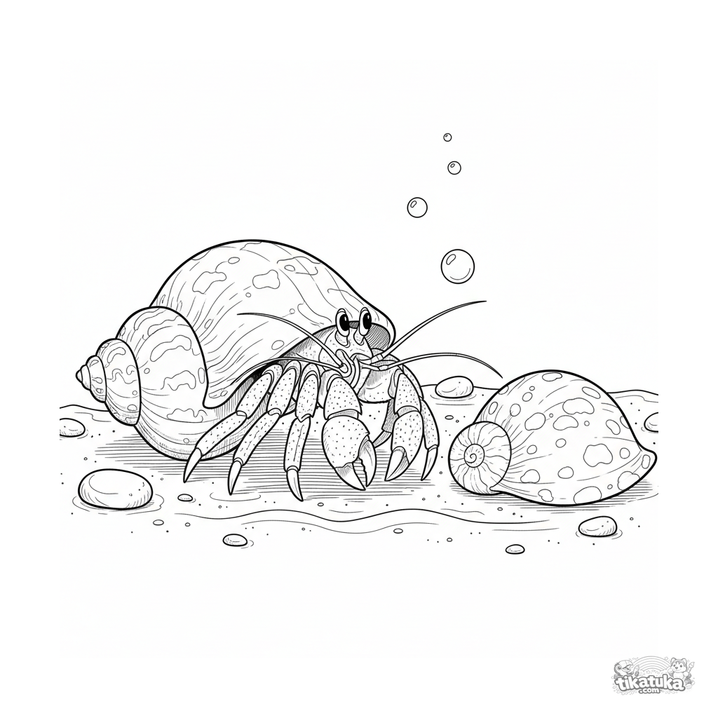 Детальная раскраска для 10-12 лет: краб-отшельник выбирает новый домик на солнечном песчаном мелководье. Реалистичный стиль с анатомическими деталями.