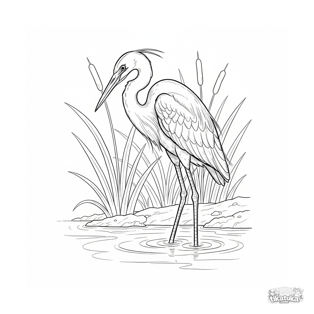 Сложная раскраска для детей 10-12 лет в стиле акварельного эскиза: высокая цапля неподвижно стоит на одной ноге в мелком прозрачном ручье, наблюдая за добычей.