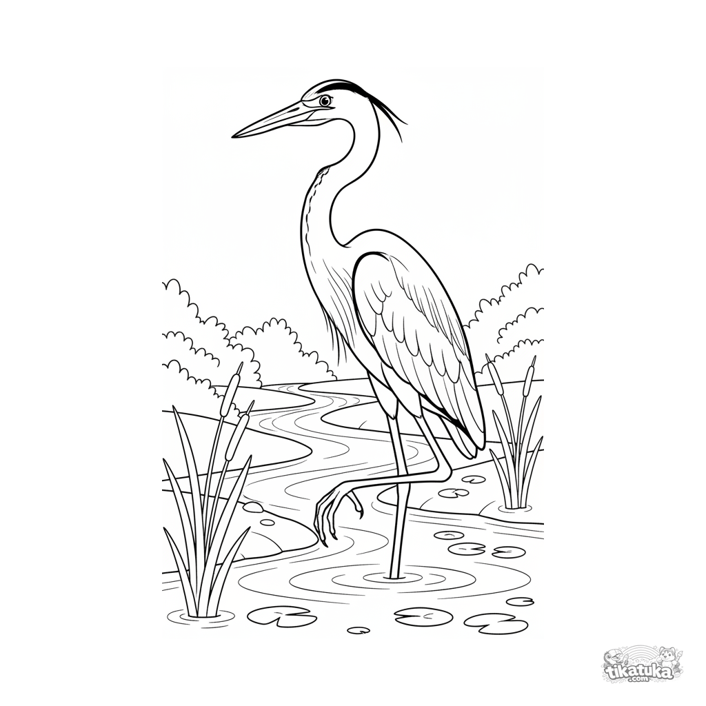 Раскраска для детей 7-9 лет: высокая цапля замерла на мелководье у ручья в ожидании добычи. Изящные линии, ряска, камыши.