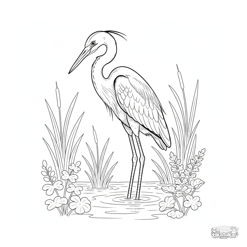 Раскраска для детей 7-9 лет: высокая серая цапля замерла на одной ноге на мелководье у ручья, высматривая рыбу среди водных растений.