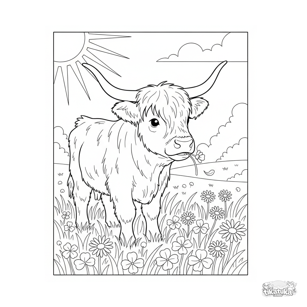 Раскраска для детей: пушистый теленок хайлендской коровы пасется на весеннем лугу среди клевера и ромашек. Контуры ясные, тело полностью видно, широкие поля.