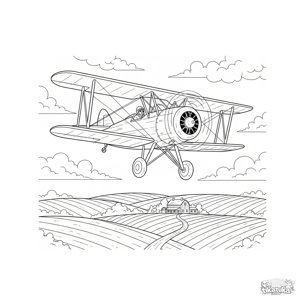 Сложная раскраска для мальчиков 7-12 лет: исторический биплан летит над холмистой местностью. Высокая детализация, реалистичное изображение самолета и пейзажа.