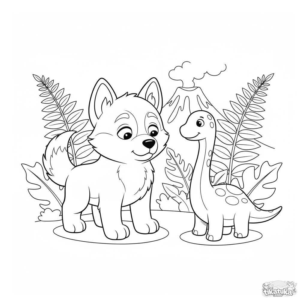 Раскраска для детей: хаски Лутик встречает милого динозаврика в доисторических джунглях. Дружелюбные персонажи, простой фон, для возраста 4-6 лет.