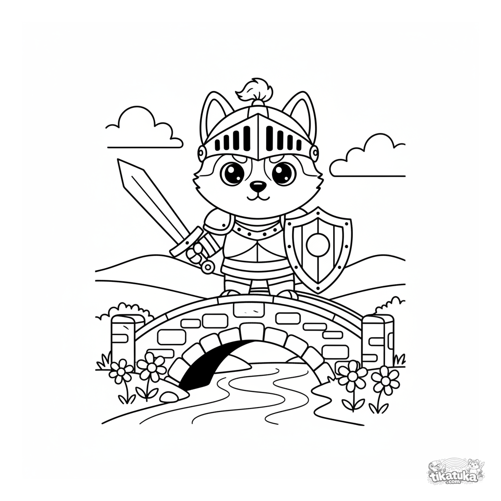 Раскраска для мальчиков: хаски-рыцарь в доспехах охраняет каменный мостик. Динамичная поза, простой фон, для детей 5-9 лет.
