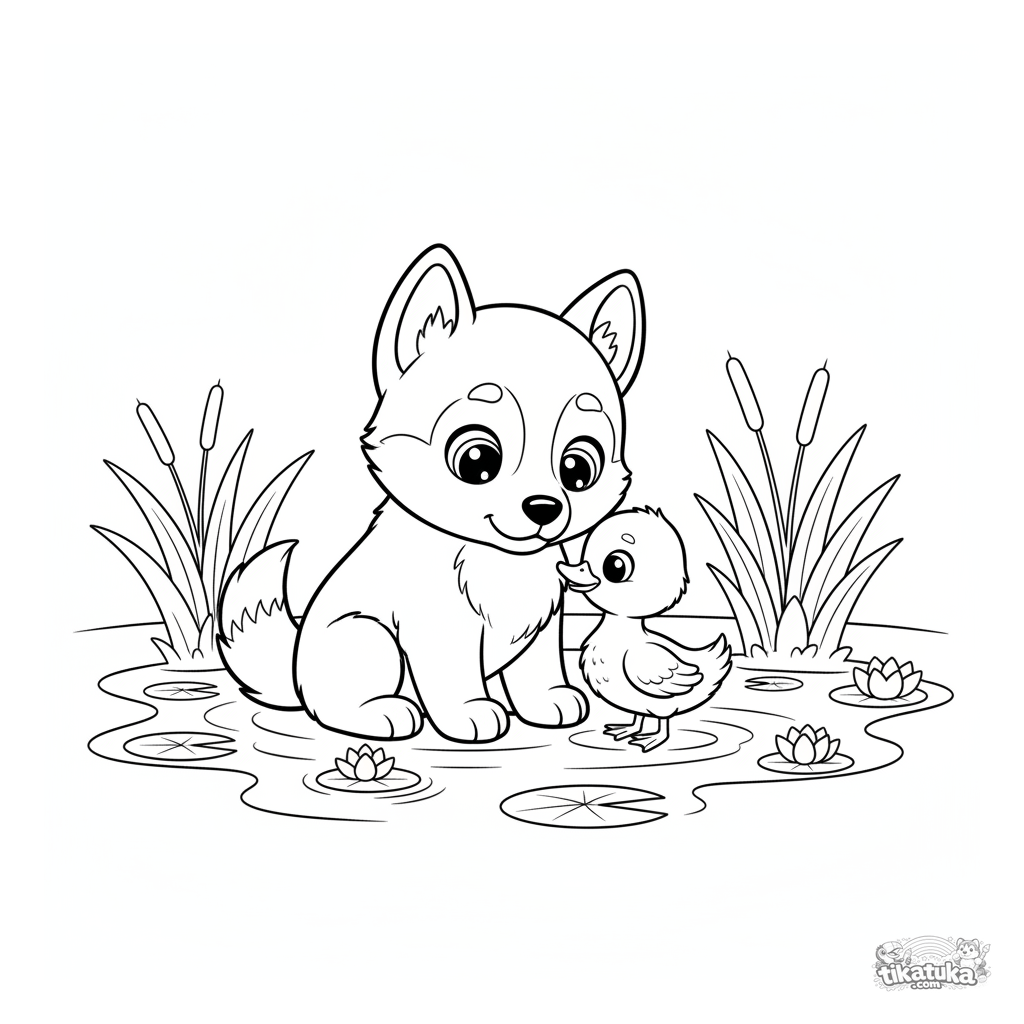 Раскраска для детей: щенок хаски Лутяк осторожно знакомится с маленьким пушистым утёнком на берегу тихого пруда с кувшинками. Тема дружбы.