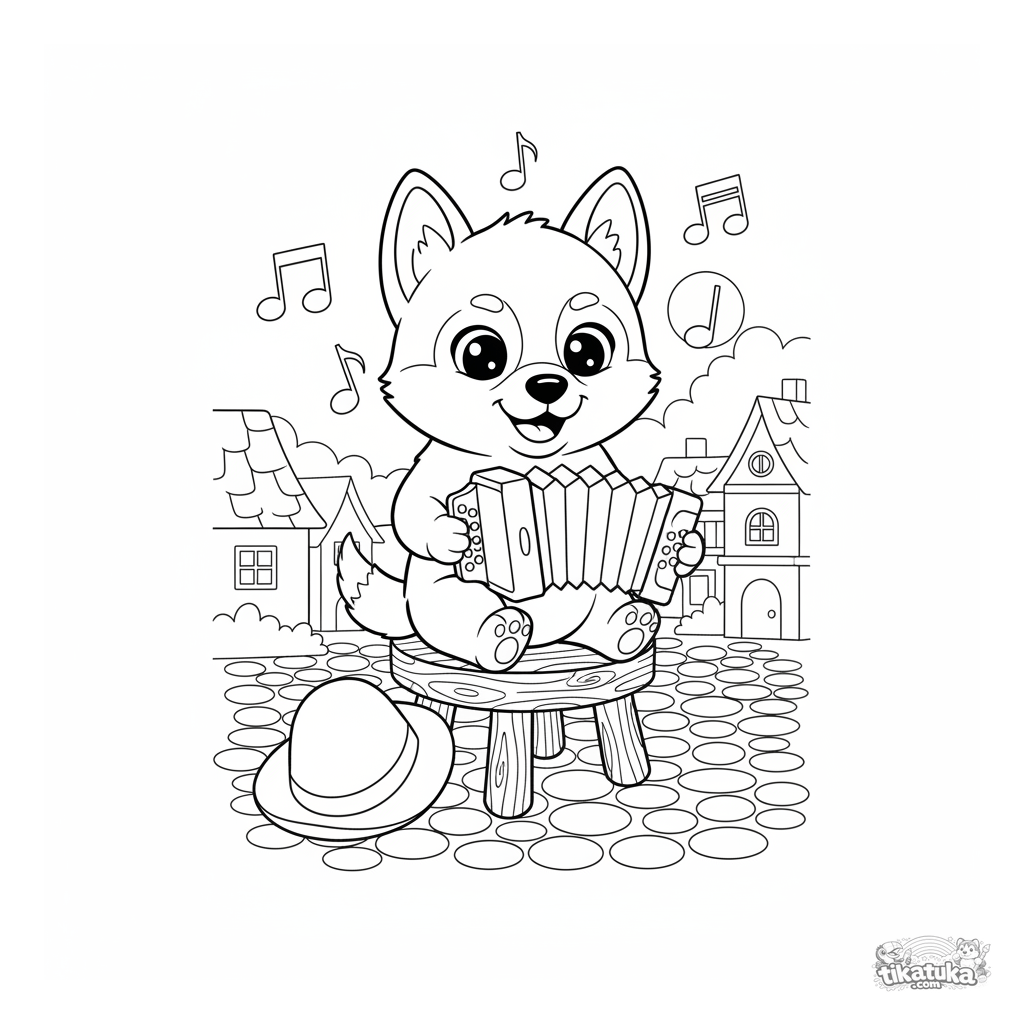 Музыкальная раскраска: хаски играет на гармони на деревенской площади. Весёлые нотки, простой фон, для детей 5-10 лет.