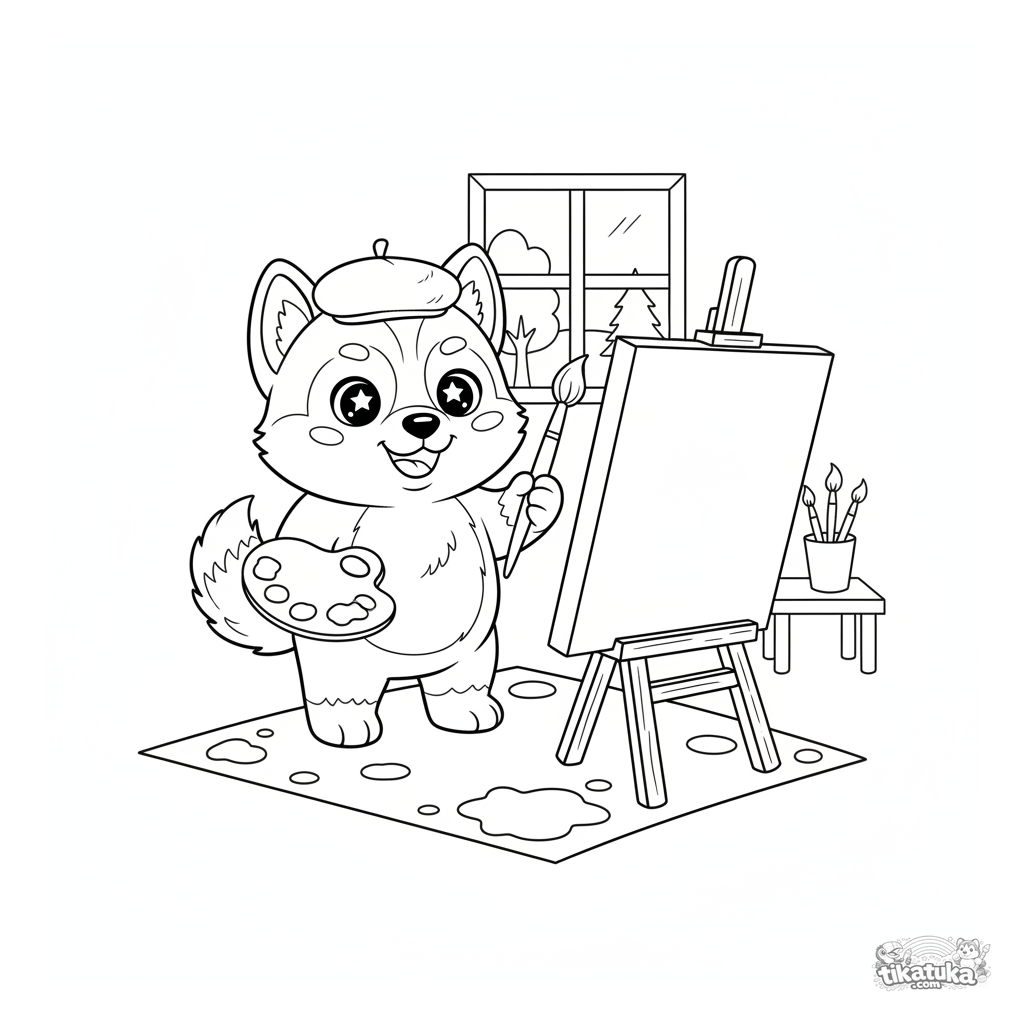 Раскраска для детей с хаски-художником. Плюшевый щенок в берете рисует картину. Веселая творческая сцена с мольбертом и красками.
