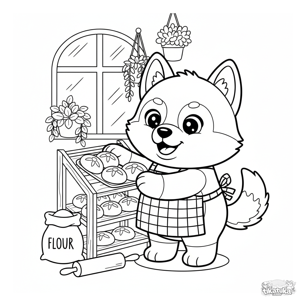 Раскраска с хаски-пекарем для детей 4-6 лет. Милый плюшевый щенок в фартуке раскладывает булочки в пекарне. Чистые линии, простые формы для легкого раскрашивания.