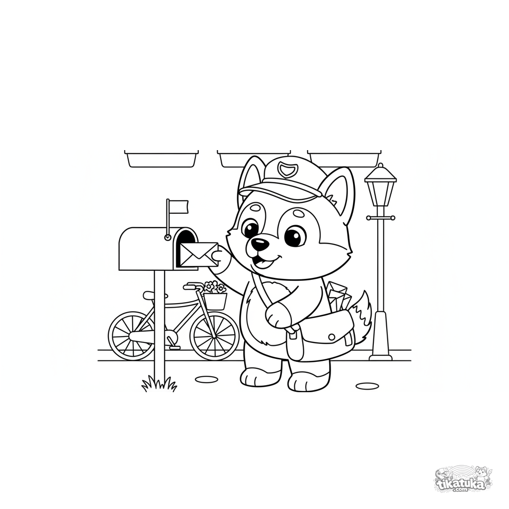Раскраска с хаски-почтальоном. Детская раскраска для детей 4-6 лет. Изображен щенок-игрушка, доставляющий письма в почтовый ящик на улице.