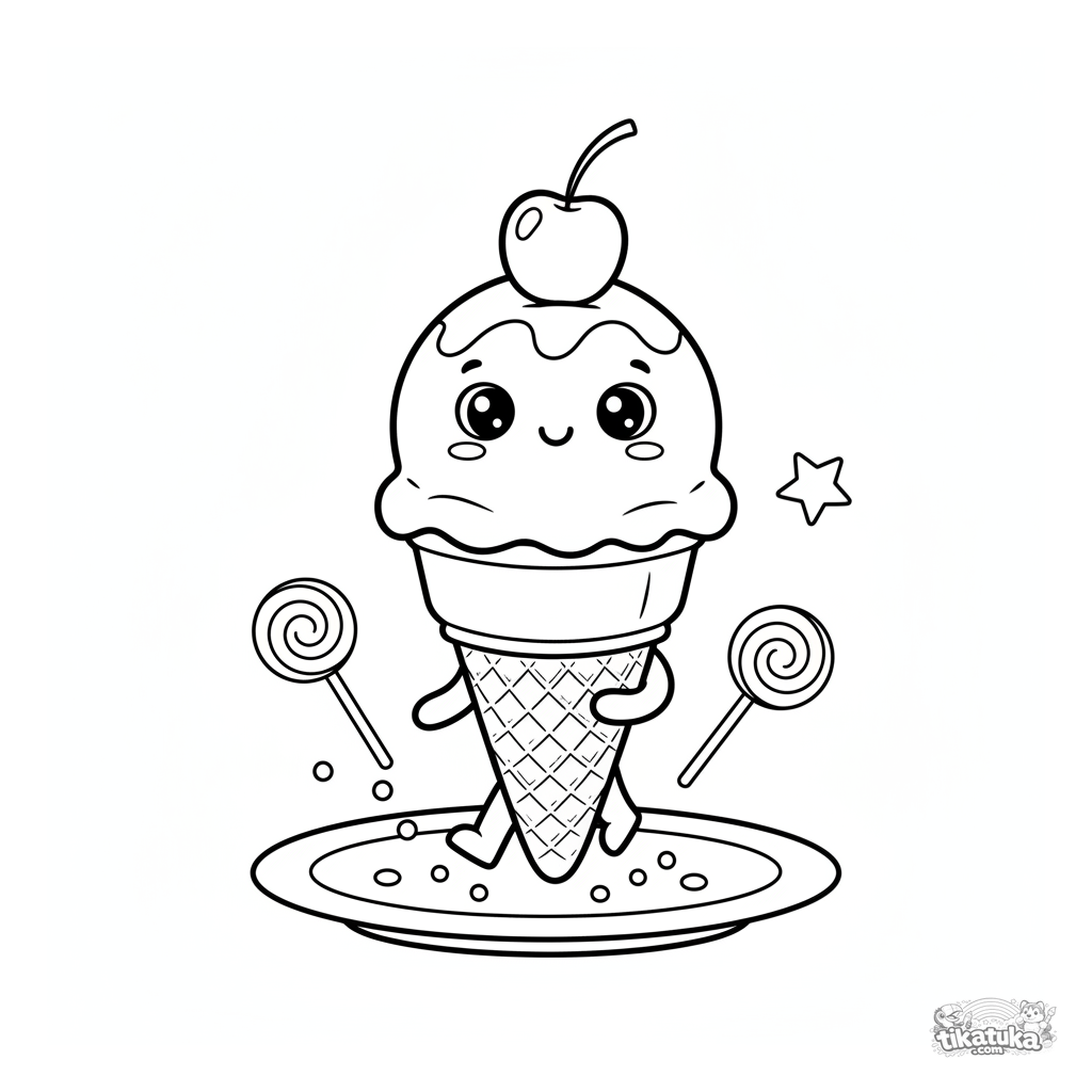 Раскраска для детей: шарик мороженого в вафельном рожке марширует по тарелке. Весёлая сцена с посыпкой и вишенкой для детей 4-6 лет.