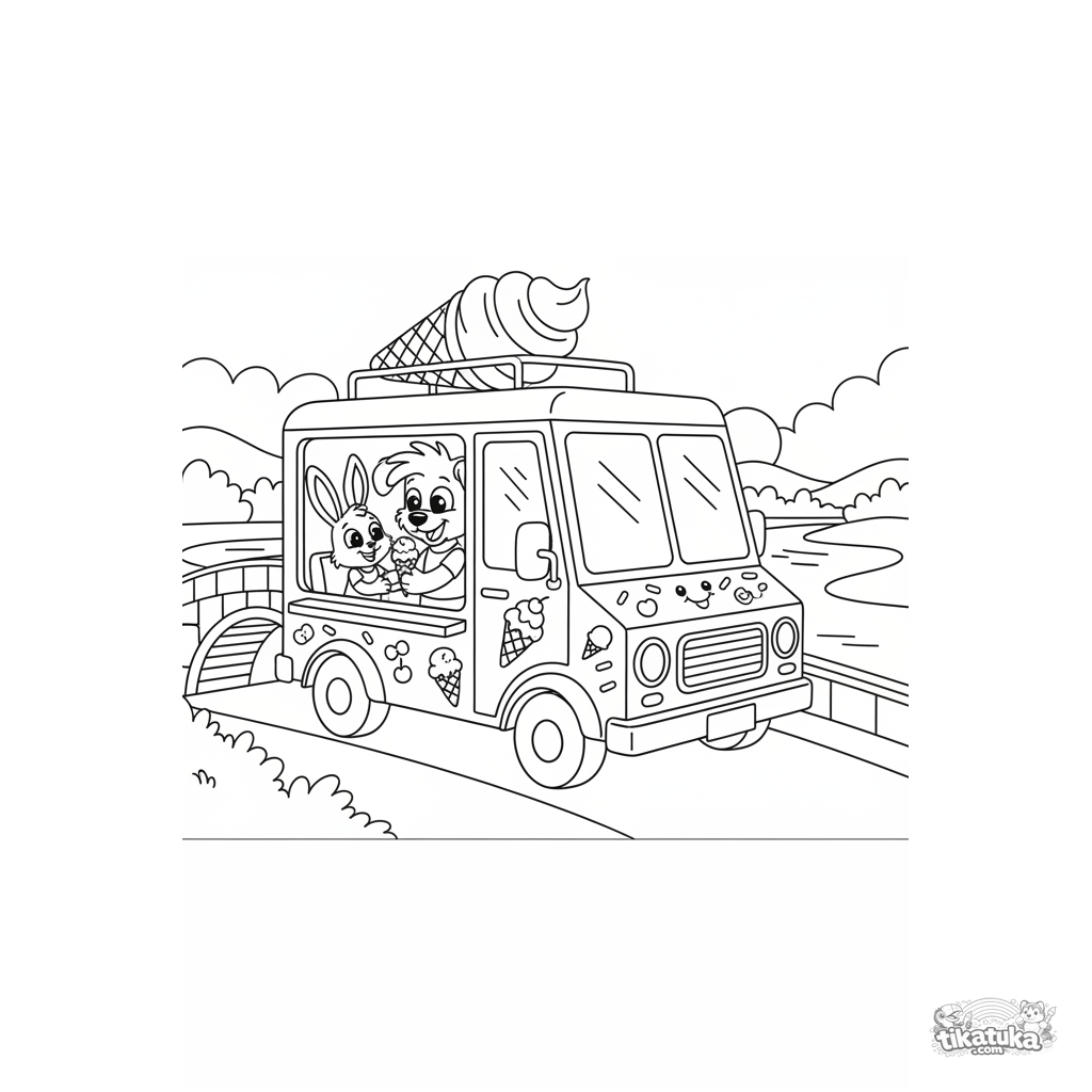 Веселая раскраска для детей 4-6 лет: яркий фургон с мороженым остановился на мосту над рекой. Сцена с животными персонажами создает радостное настроение.