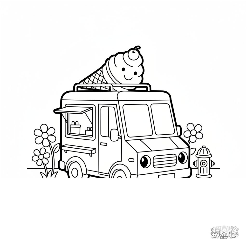 Простая раскраска с весёлым фургоном мороженого, который стоит на улице. Для малышей 2-3 лет. Крупные простые формы для первых раскрасок.