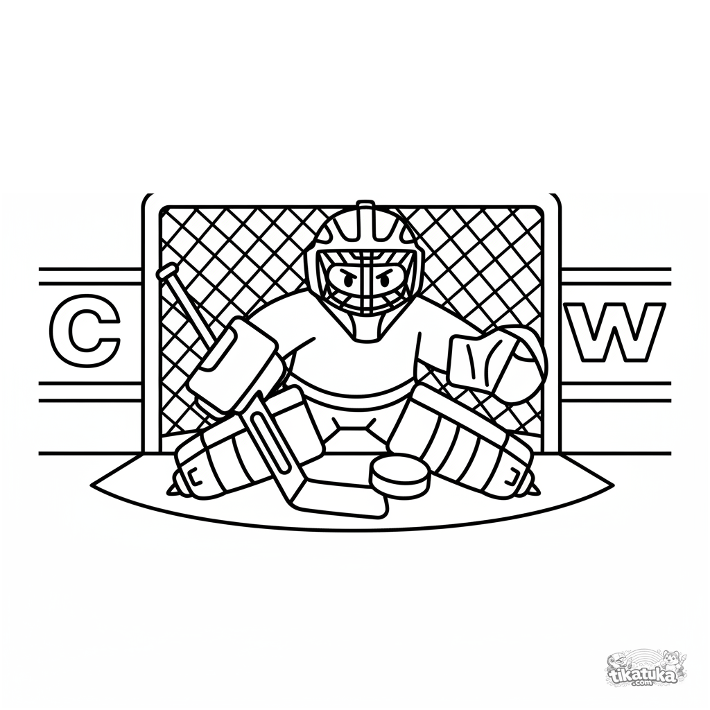 Раскраска для детей: хоккейный вратарь в маске блокирует летящую шайбу на ледовой арене. Для мальчиков и девочек 4-6 лет.