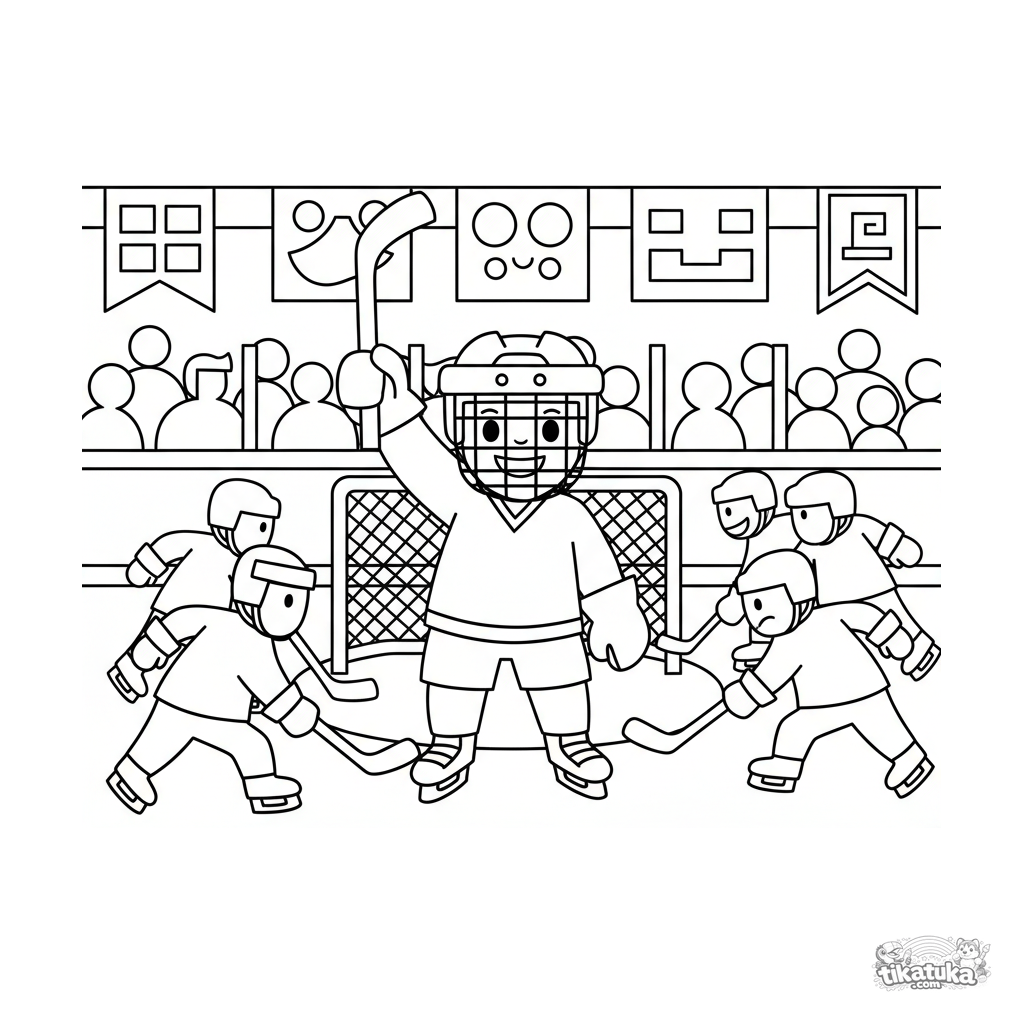 Детская раскраска: хоккеист радостно празднует забитый гол на ледовой арене. Для детей 4-6 лет, сцена с действием и эмоциями.