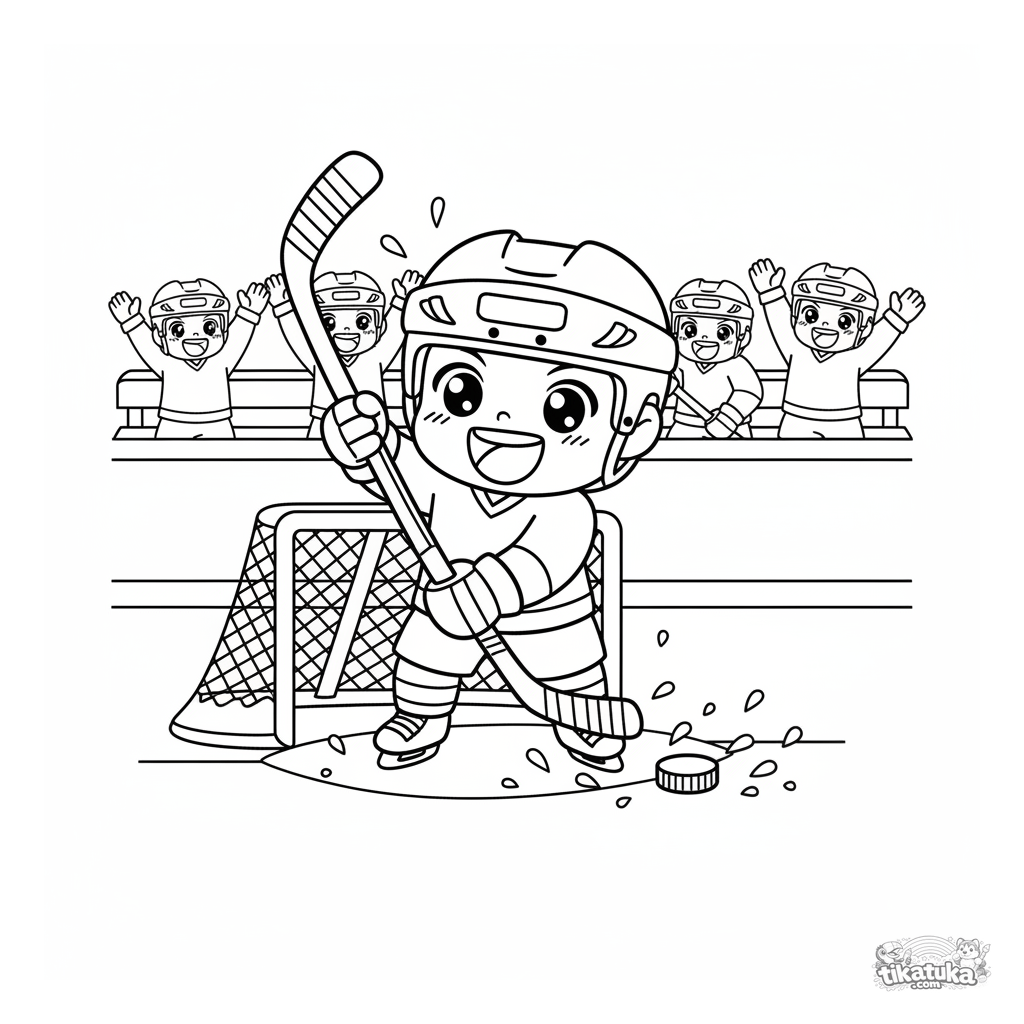 Раскраска для детей: хоккеист празднует забитый гол на ледовой арене. Подходит для детей 4-6 лет, сцена с действием и эмоциями.