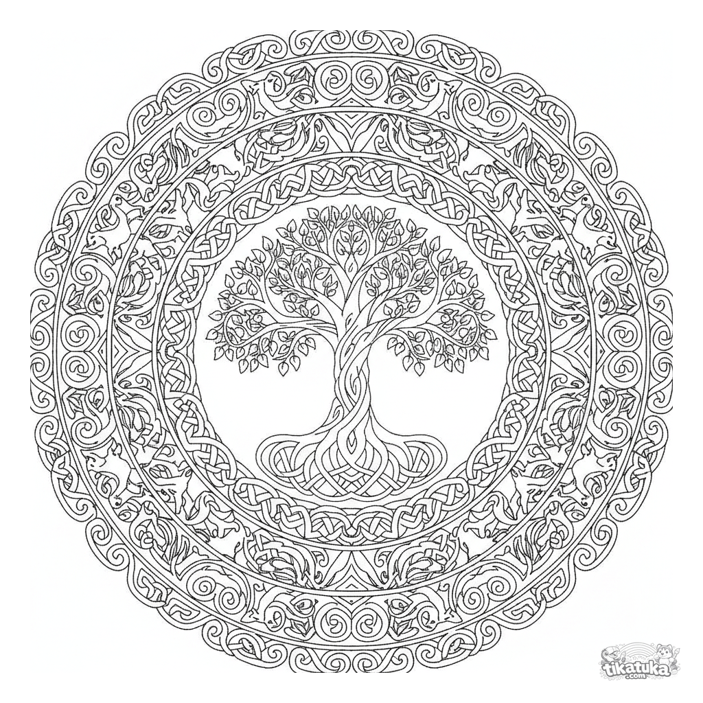 Очень сложная мандала-раскраска в кельтском стиле для детей 10-12 лет. Изображает Древо жизни, окружённое кольцами трилистников, животных и спиралей.