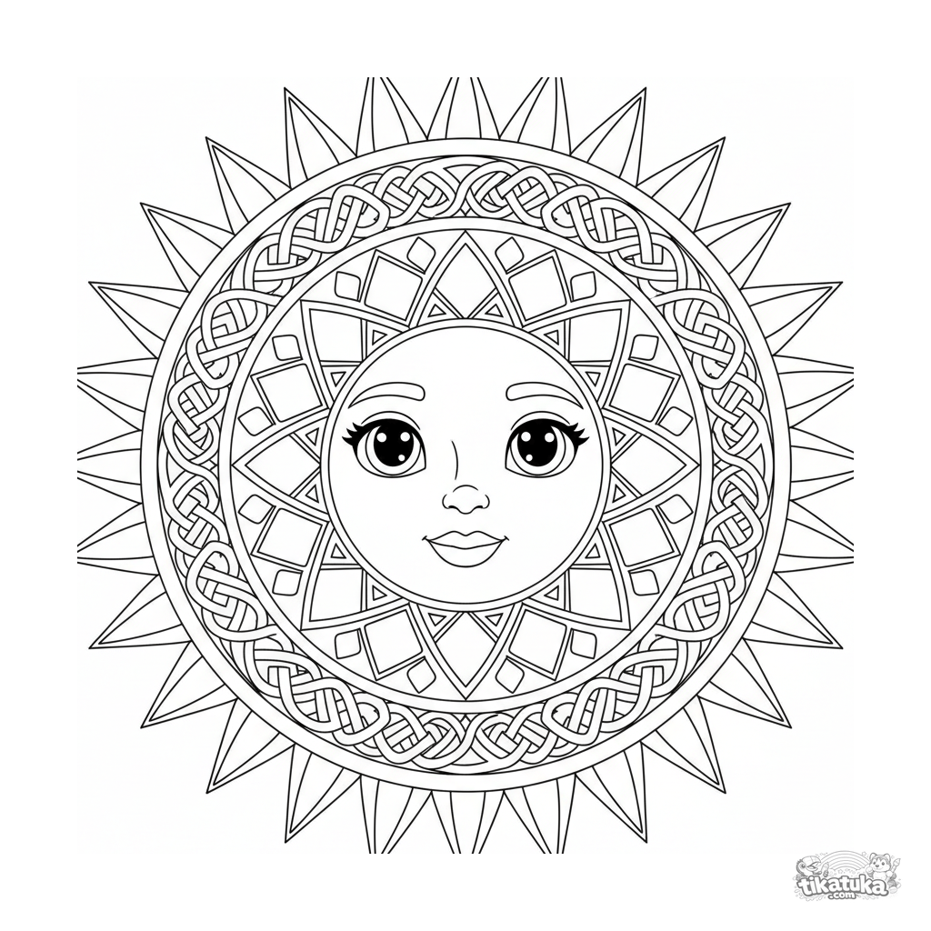 Сложная геометрическая мандала-раскраска для детей 10-12 лет. Восьмилучевая симметрия, переплетающиеся узоры, кельтские узлы и лучи — идеально для детального раскрашивания.