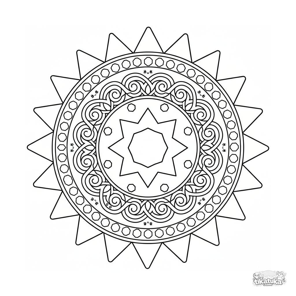 Сложная геометрическая мандала-раскраска для детей 10-12 лет. Восьмиконечная звезда в центре, кельтские узлы, шестиугольники и треугольные лучи. Симметричный узор.