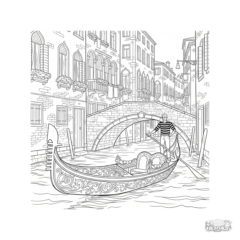 Сложная раскраска для детей 10-12 лет: детализированная венецианская гондола проплывает под каменным мостом. Архитектура, гондольер. Для терпеливых художников.