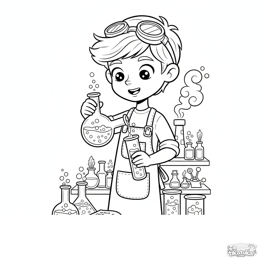Раскраска для детей 4-6 лет: подмастерье изобретателя в секретной лаборатории осторожно смешивает светящиеся зелья в колбах.