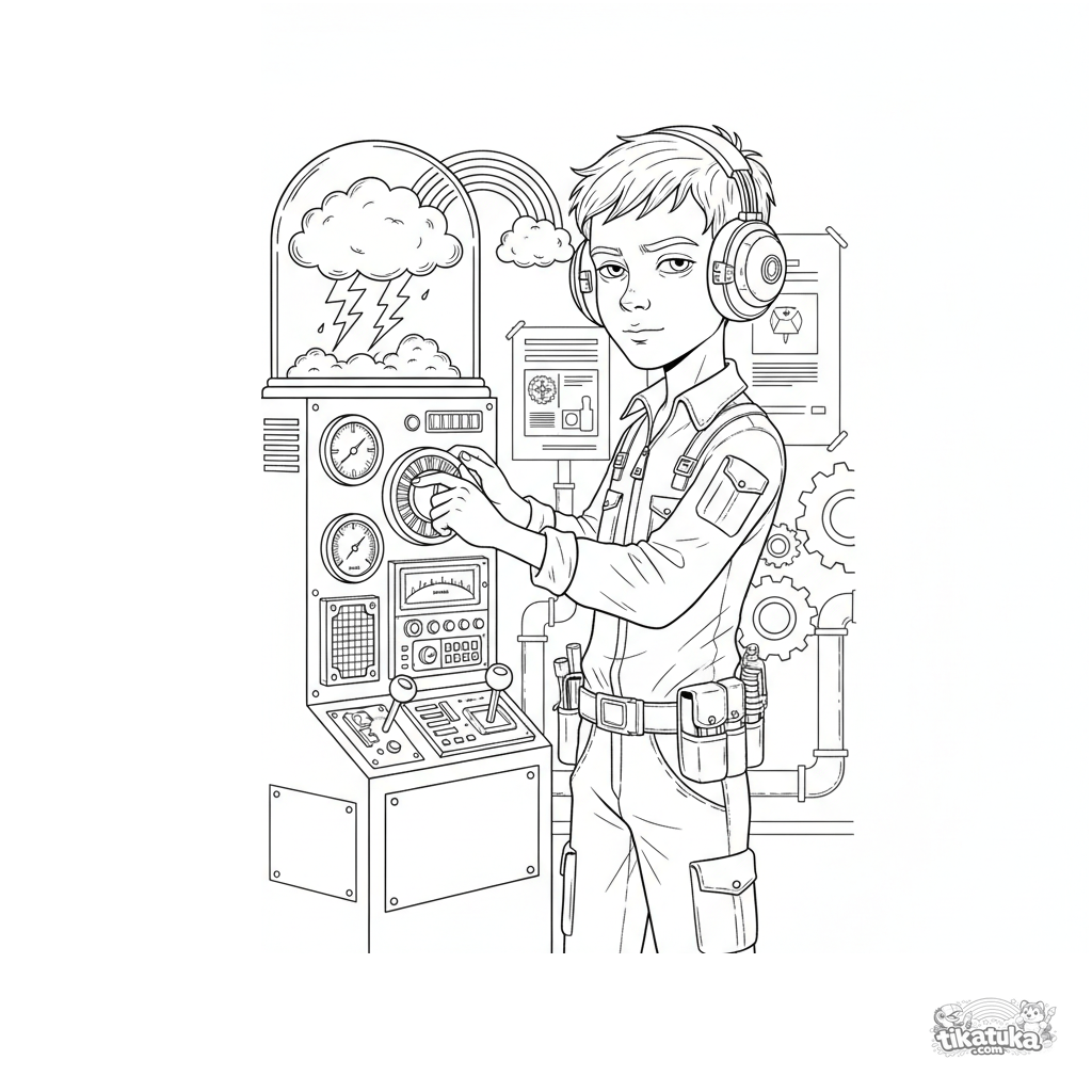Раскраска для детей 10-12 лет: изобретатель в секретной лаборатории калибрует пульт управления погодой, создавая мини-бурю под стеклянным куполом. Приборы, рычаги, молнии, радуга.