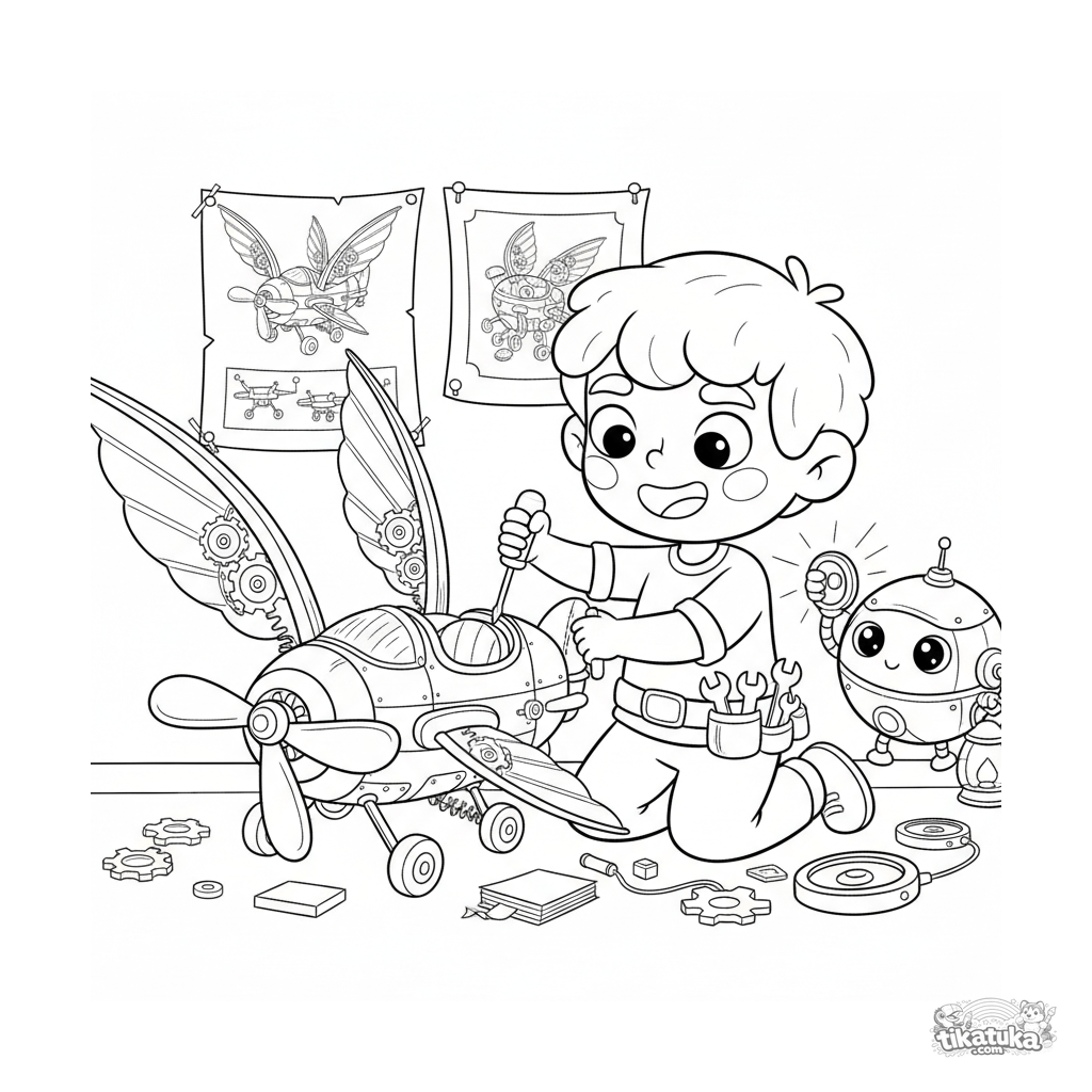 Раскраска для детей 4-6 лет: мальчик-изобретатель в секретной мастерской чинит летательный аппарат с помощью маленького робота.