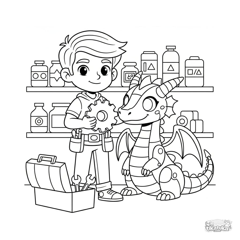 Раскраска для детей 7-9 лет: мальчик-изобретатель и его верный механический дракон в секретной лаборатории. Сцена дружбы и творчества.