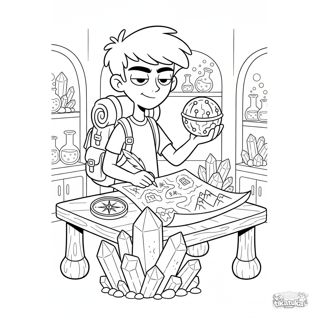 Раскраска для мальчиков 7-9 лет: юный исследователь-изобретатель в секретной лаборатории составляет карту таинственной кристаллической формации.