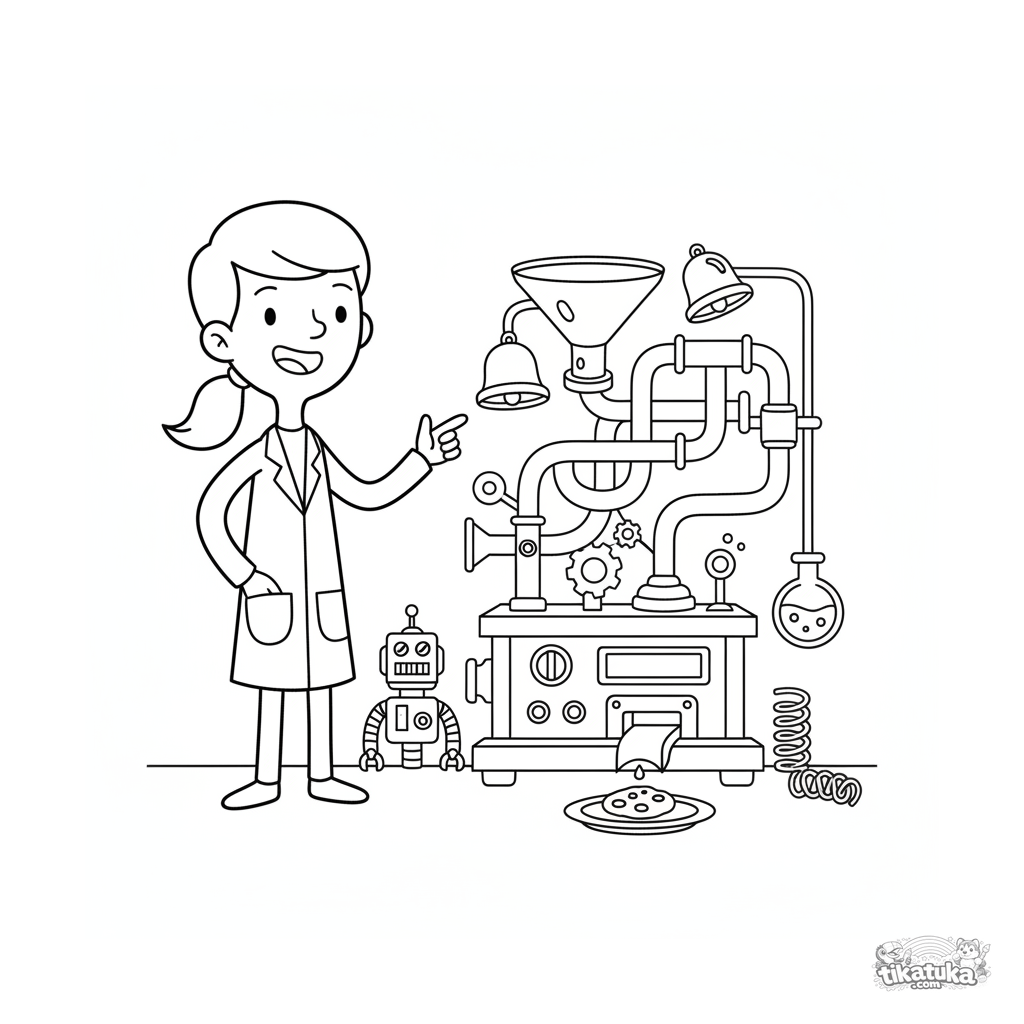 Раскраска для детей 7-9 лет: юный изобретатель с гордостью демонстрирует свой забавный автомат для выдачи печенья в секретной лаборатории.
