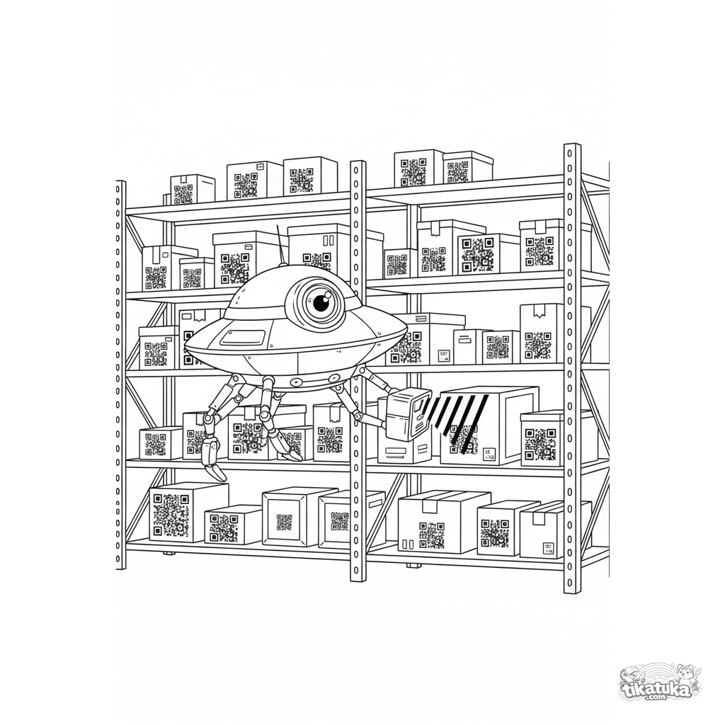 Раскраска для детей 10-12 лет: детализированный инвентарный дрон со сканирующим лучом летает между стеллажами склада, считывая QR-коды на коробках. Технический стиль.