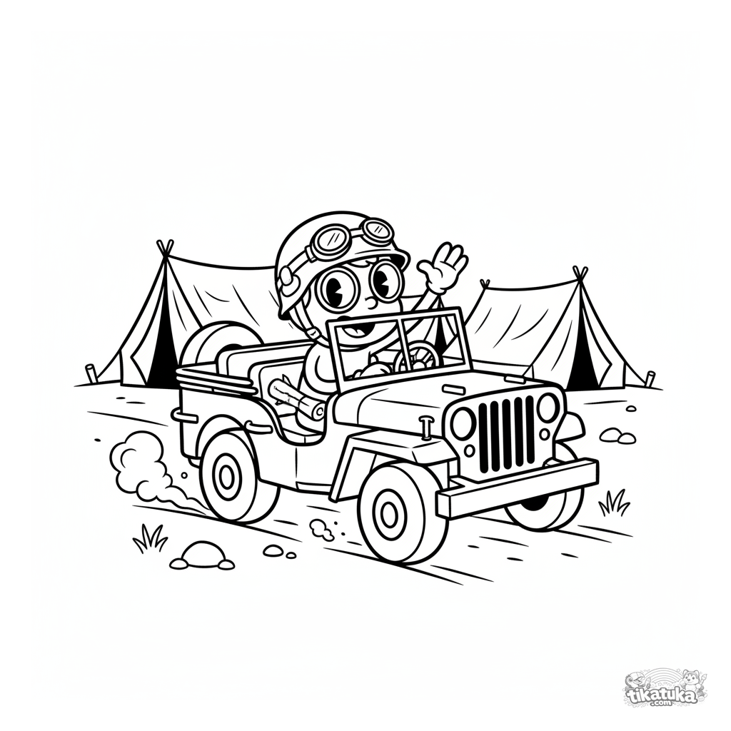 Раскраска для детей 4-6 лет: старый армейский джип Виллис едет по дороге возле полевого штаба с палатками. Весёлый водитель машет рукой.
