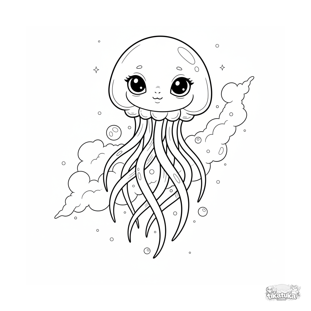 Раскраска для детей 7-9 лет: изящный, медузообразный инопланетянин плавно плывет в космической туманности среди звезд. Плавные линии, фантастическое существо.