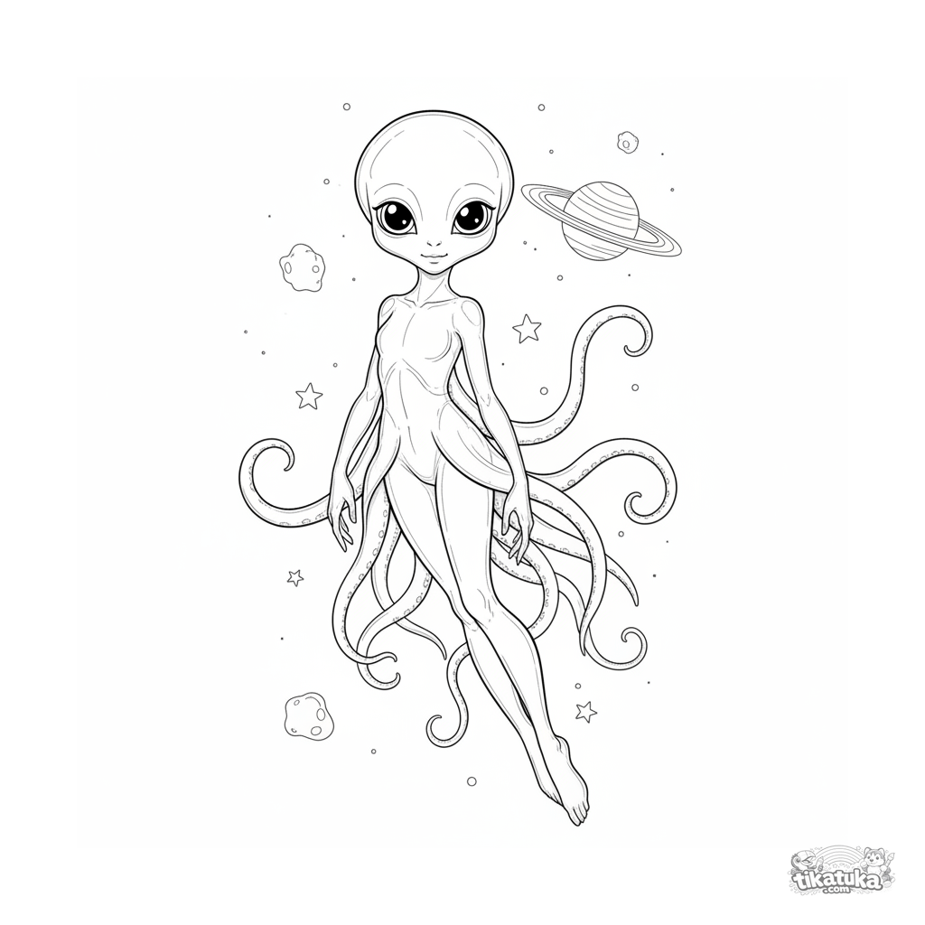 Раскраска для детей 7-9 лет: изящное медузообразное существо парит среди звезд на фоне кольцевой планеты. Четкие, натуралистичные контуры.