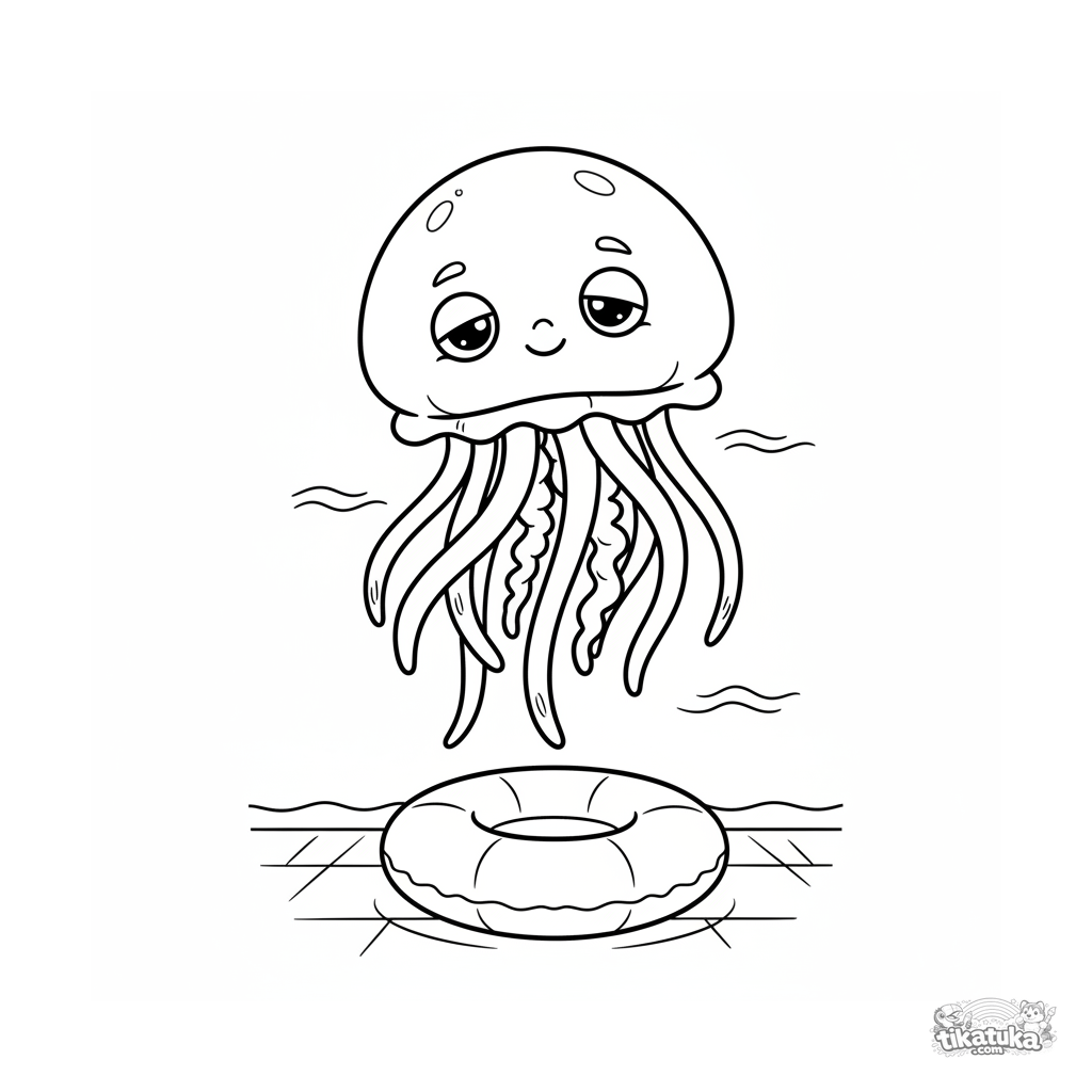 Раскраска с медузой в стиле мягкой игрушки, плывущей мимо надувного круга в бассейне. Для детей 4-6 лет. Плавные линии, умиротворяющая сцена.
