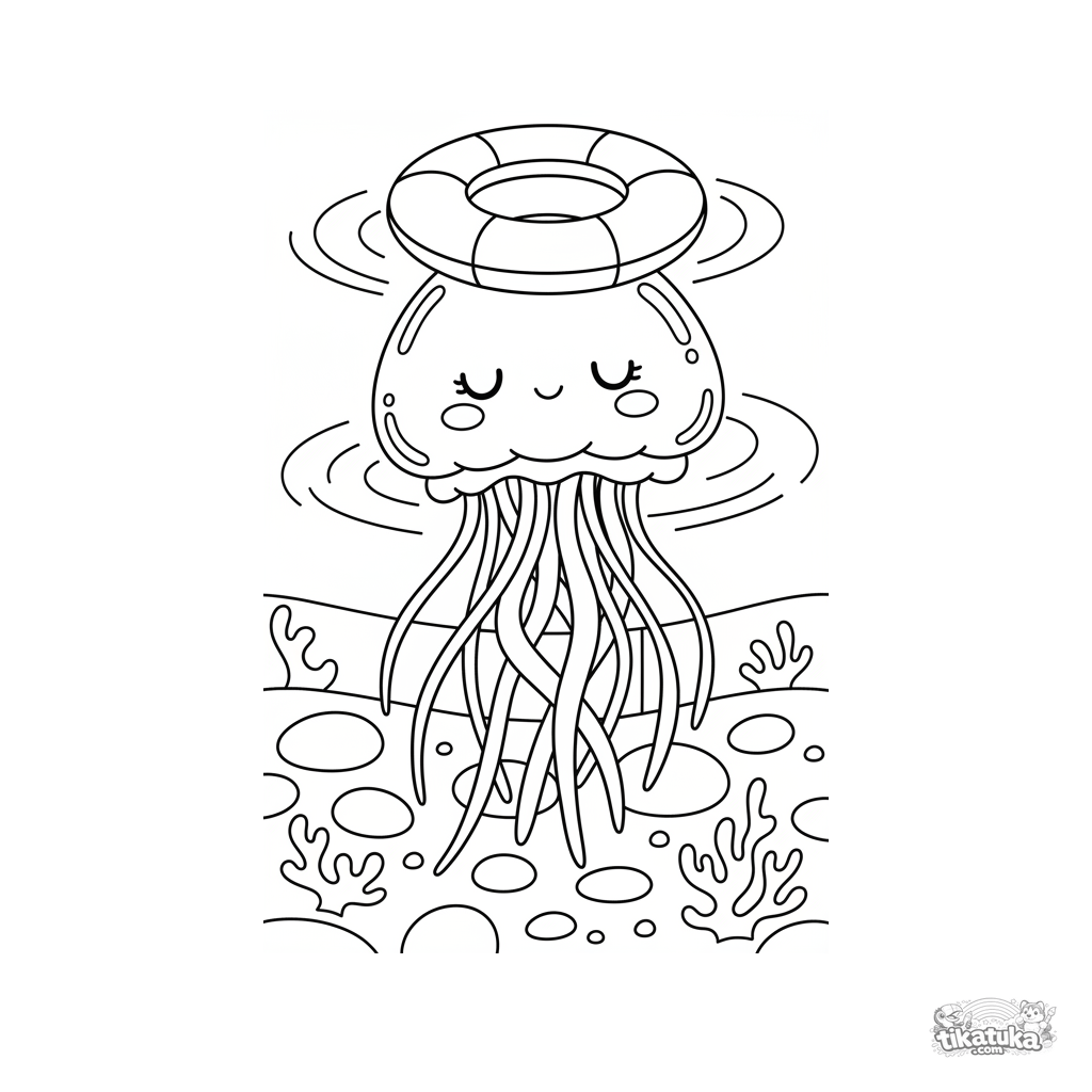 Раскраска для детей 7-9 лет: нежная медуза с длинными щупальцами дрейфует в глубокой части бассейна под надувным кругом. Плавные линии, умиротворенное настроение.