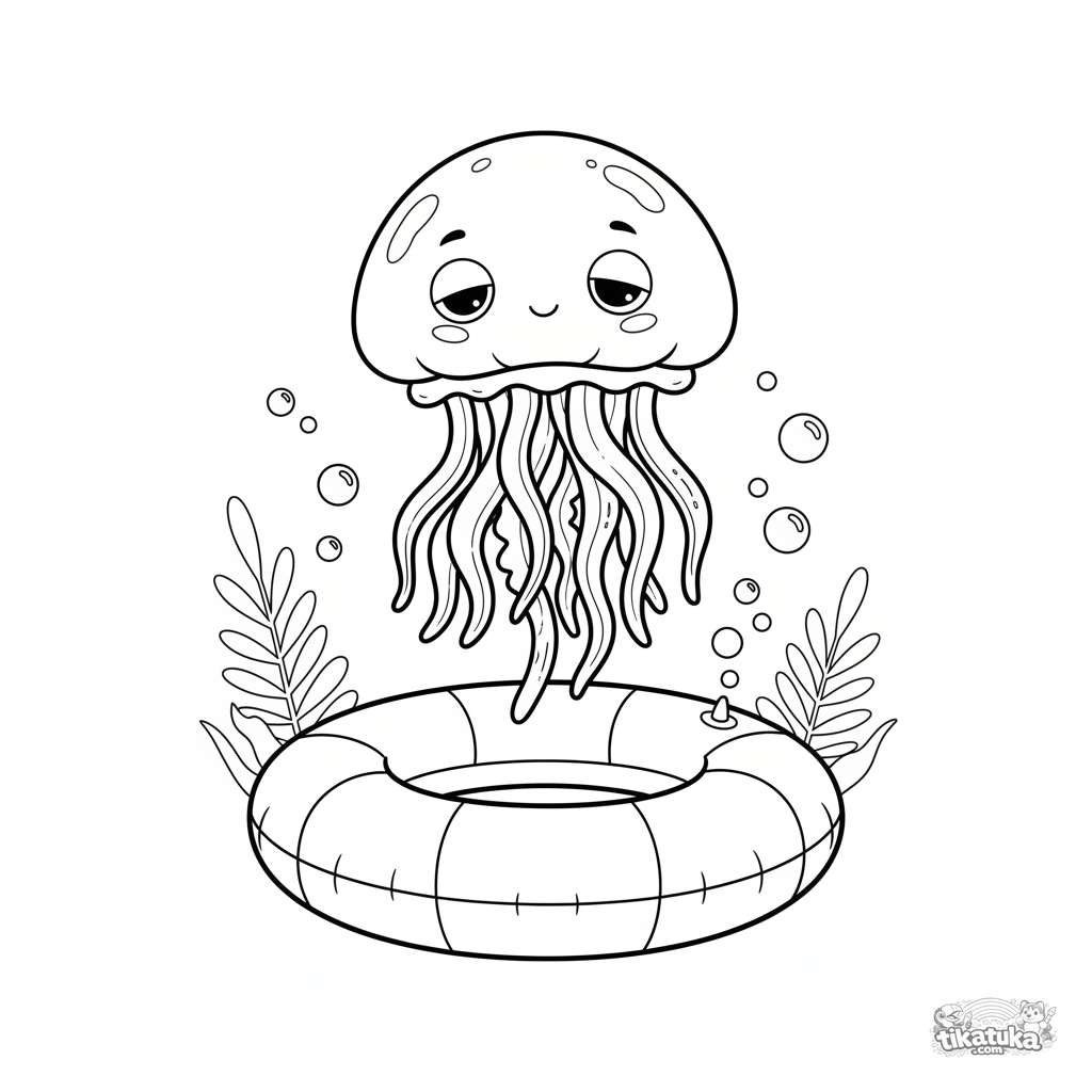 Раскраска для детей 7-9 лет: нежная медуза плавает над надувным кругом на дне бассейна. Плавные линии, спокойная сцена, умеренная детализация.