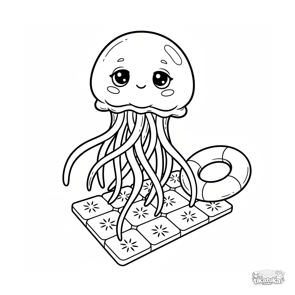 Раскраска для детей 4-6 лет: нежная медуза с длинными щупальцами плавно плывет над плиткой на дне бассейна. Плавные линии и спокойное выражение.